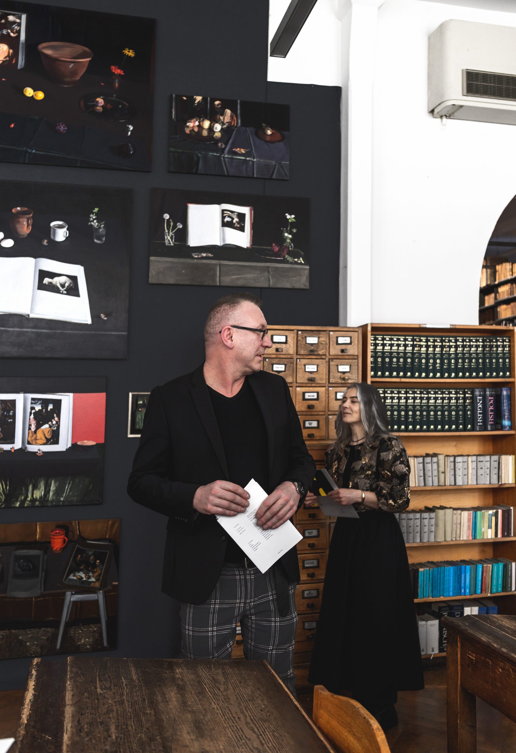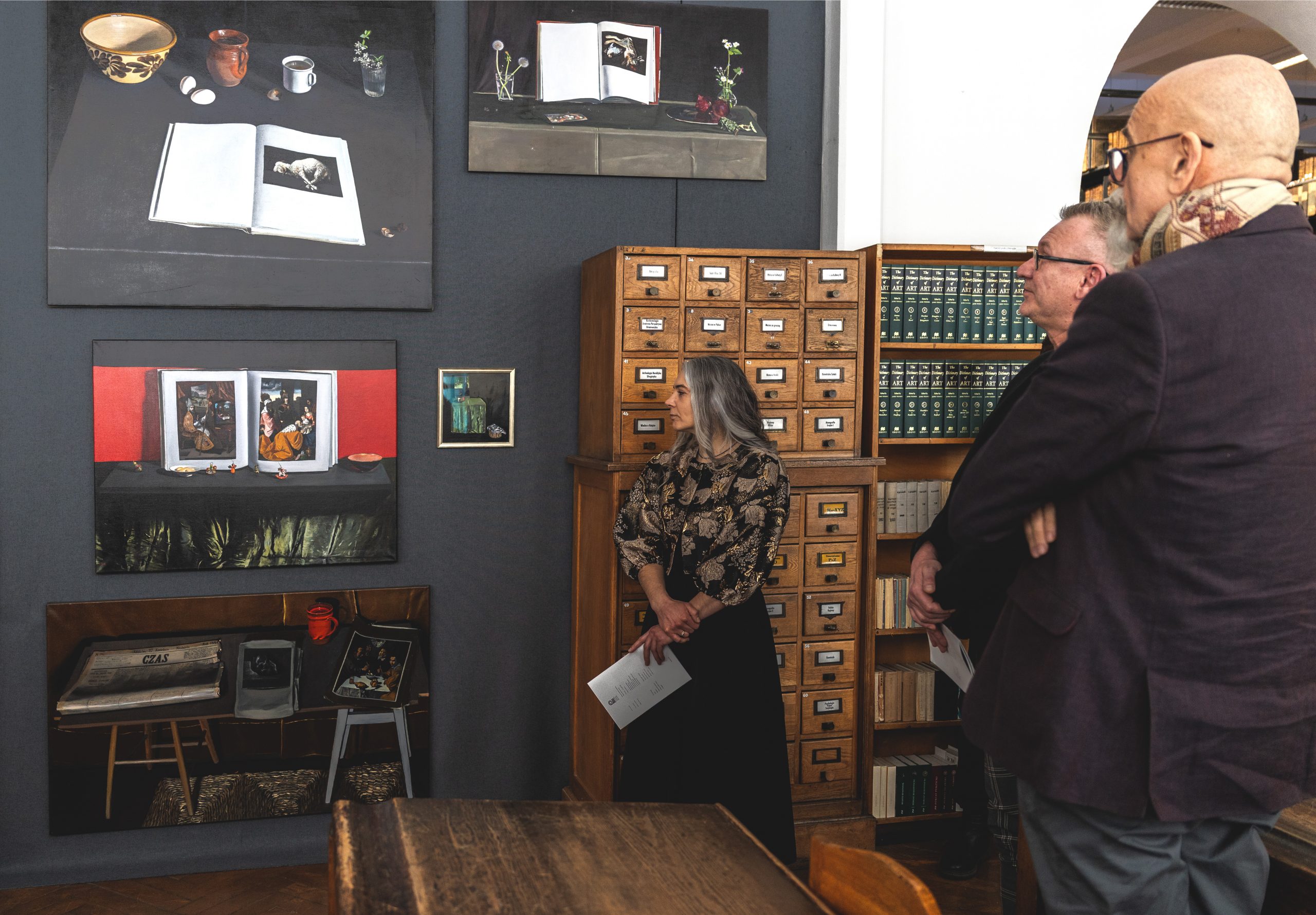 Artystka podejmuje twórczy dialog z historią sztuki, przywołując ideę Biblia pauperum – „Biblii ubogich” – w której obraz był narzędziem duchowego i symbolicznego przekazu. W jej interpretacji dawne arcydzieła nie funkcjonują jako zamknięte cytaty, lecz jako żywe punkty odniesienia. Reprodukcje znanych przedstawień, otwarte księgi, fragmenty obrazów zostają wpisane w kompozycje przypominające współczesne martwe natury. Przedmioty rozmieszczone są z uważnością, niemal jak liturgiczne naczynia, budując atmosferę skupienia i medytacji.